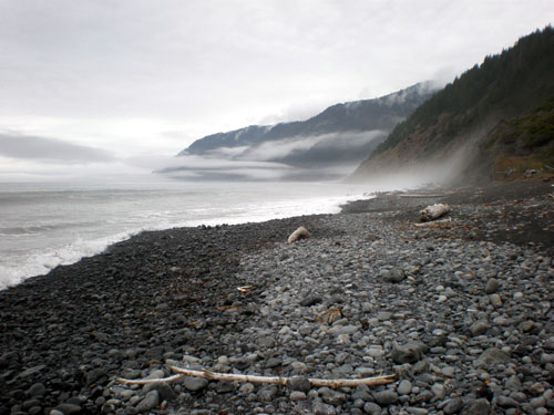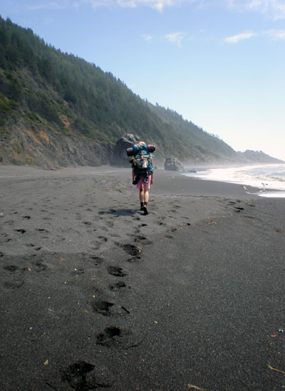 It is just as well this morning, because we must make our mark three miles downshore in time to beat high tide. Otherwise, we’ll be swimming home! There are several parts of the coast that become impassable when the water rises. Russ and I pack our gear, filter water & start back down the shore. It is familiar territory and yet things have changed. For one, the sky is clear! I am also surprised to find MONSTER Bear tracks (yes, that is a rare species only found on the Lost Coast)! They are as wide as both my fists combined! I meander up the beach with these tracks, watching as they disappear into the surf on occasion. Bubba bear dropped down from the forest early this morning for a real coastal breeze and nice walk on the beach! He must have come via a creek, because the whole coastline is cliff! Imagine that: a beach bear!