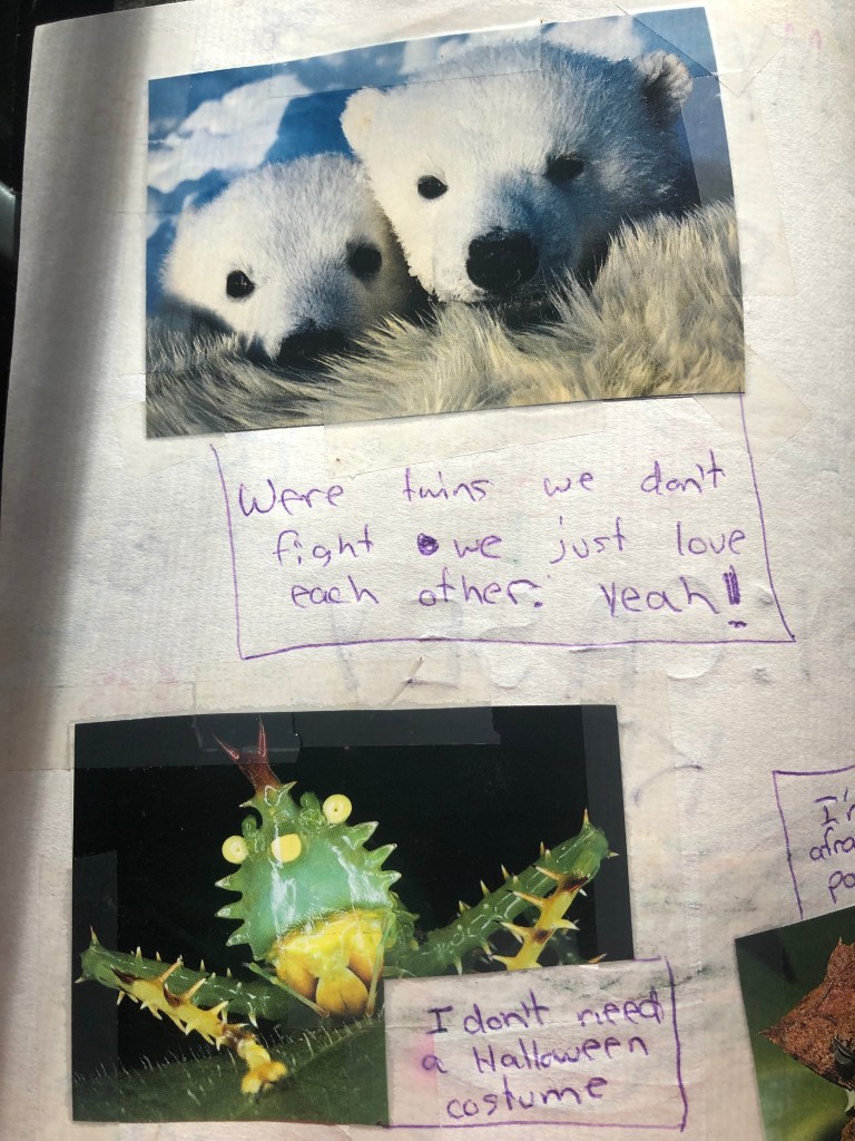 I am visiting Maryland where I grew up. Mom has all these books I made as a kid. I joked that it was the start of my meme making. I would cut photos of animals out of magazines and caption them. I’ve included some of these early vintage memes below.