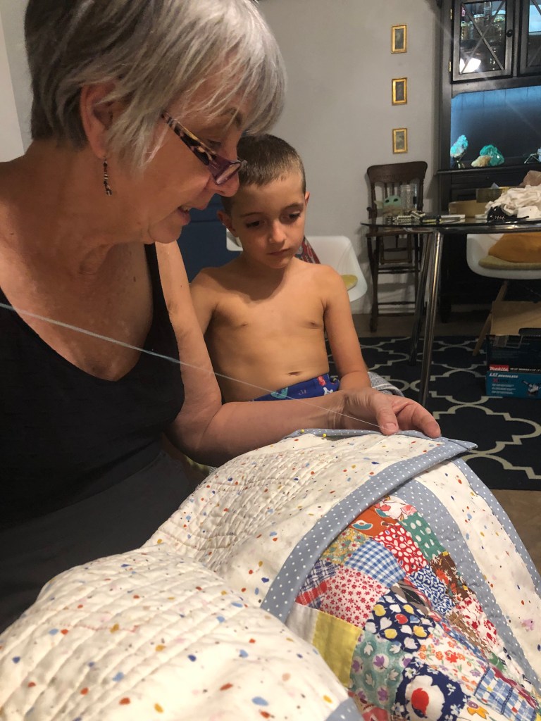 Finally, mom pins and hand stitches the edging to the back of the quilt as we sit on the couch and talk. Axel comes over from next door and helps her put the pins back in the stuffed tomato.