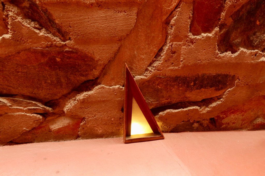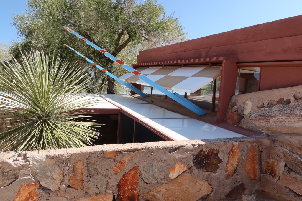 Our guide sheds light on life at Taliesin West: FLW bought the over 100 acres of desert property in the middle of nowhere. (Today it sits conveniently off of highway 101 in northeast Scottsdale.) They sourced local rock out of the mountain to build. When they found petroglyphs, it encouraged them knowing that OTHER people survived here too!