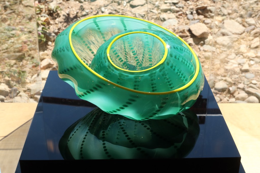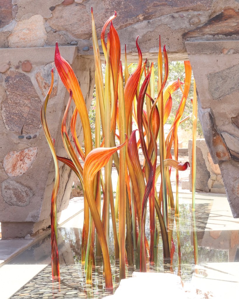 I am at the home and school of architect Frank Lloyd Wright here in Scottsdale, Arizona. I meant to visit for a very long time. Upon learning that Dale Chiuly is exhibiting, I know this is the time to go. After six months on display, I made it on the final week of Chiuly and live tours.