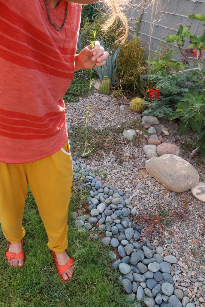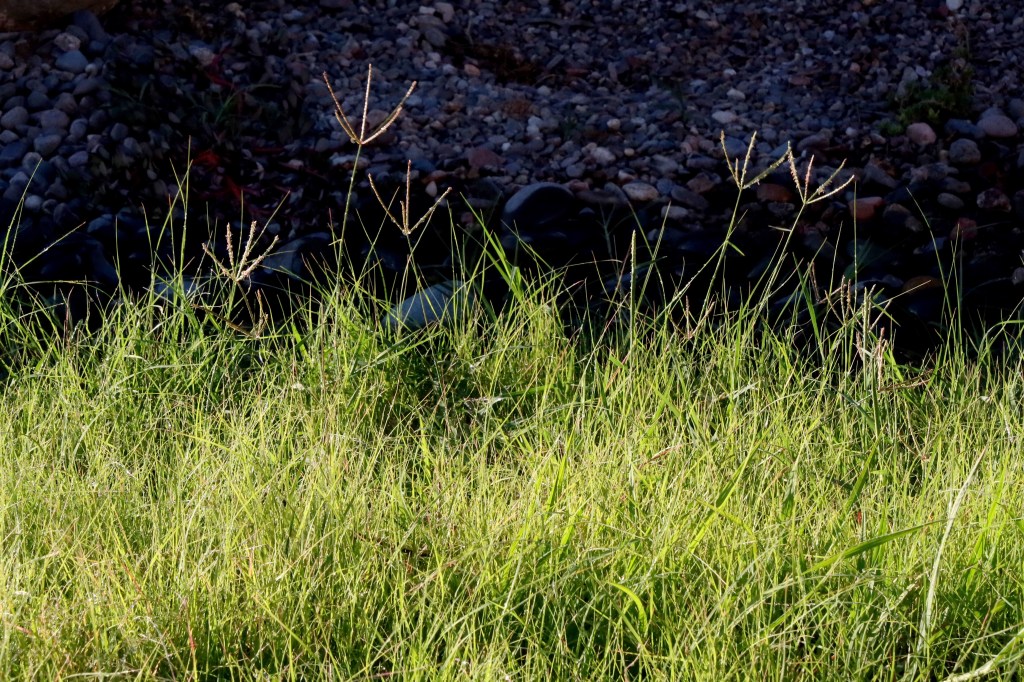 We look for crabgrass seed heads in the afternoon sun and swift but gingerly collect them for the burn pile.