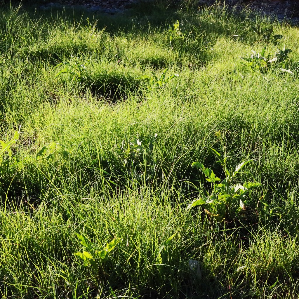 We have a happy habitat going in the grass. We are constantly weeding to keep crabgrass at bay while seeding this new lawn. I hunt runners that are reaching; I find the elbow where they drop into the ground and I pop em out. There’s a callous on the inside of my index finger and the outside of my pinky finger from yanking crabgrass.