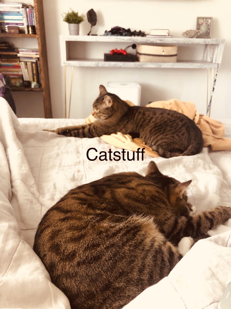 Our friend arrives for dinner. We are all chatting when the sprinklers turn on! The cats go running! I open the door and they run past all of us to hide under the bed.