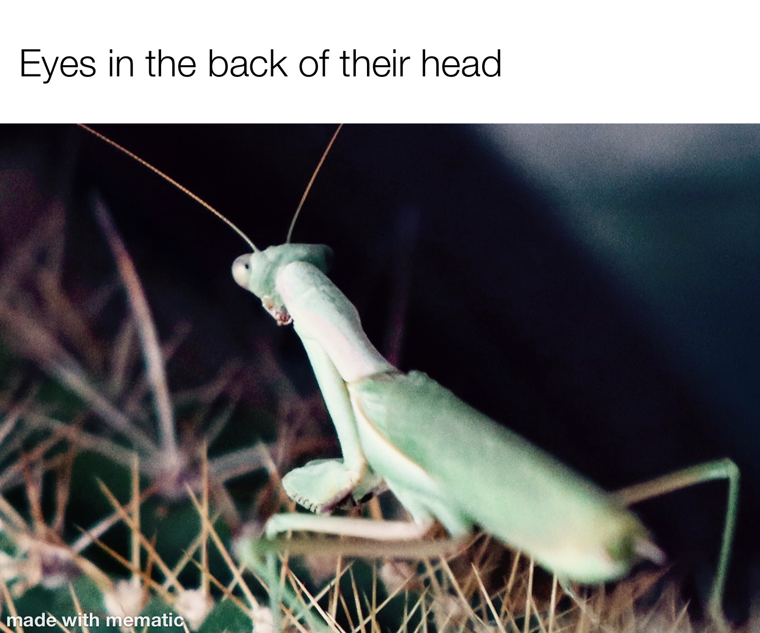 I try, unsuccessfully, to dismount the mantis onto a marigold. They insist on sticking around to lick me and climb up my arm to avoid being escorted away.